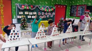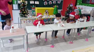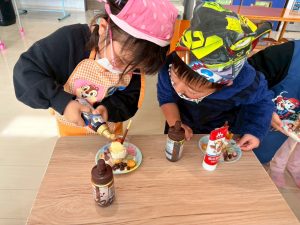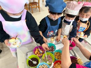 若草のがみこども園では、クリスマス会が開かれました。クリスマスについて色々お話ししたり、サンタさんの絵本を見たり、クリスマスにちなんだゲームを楽しんだりしました。その後、待ちに待ったサンタさん登場!!サンタさんとダンスで盛り上がった後、いよいよサンタさんからプレゼントをもらいました。みんな満面の笑みで、とっても嬉しそうでした。まだまだ楽しみは終わる事なく、引き続き、食育でケーキ作りをしました。給食の先生が作ってくれた物を元に、コップにクリームなど詰めてチョコレートなどトッピングして、クリスマスメニューのご馳走と一緒に頂きました。